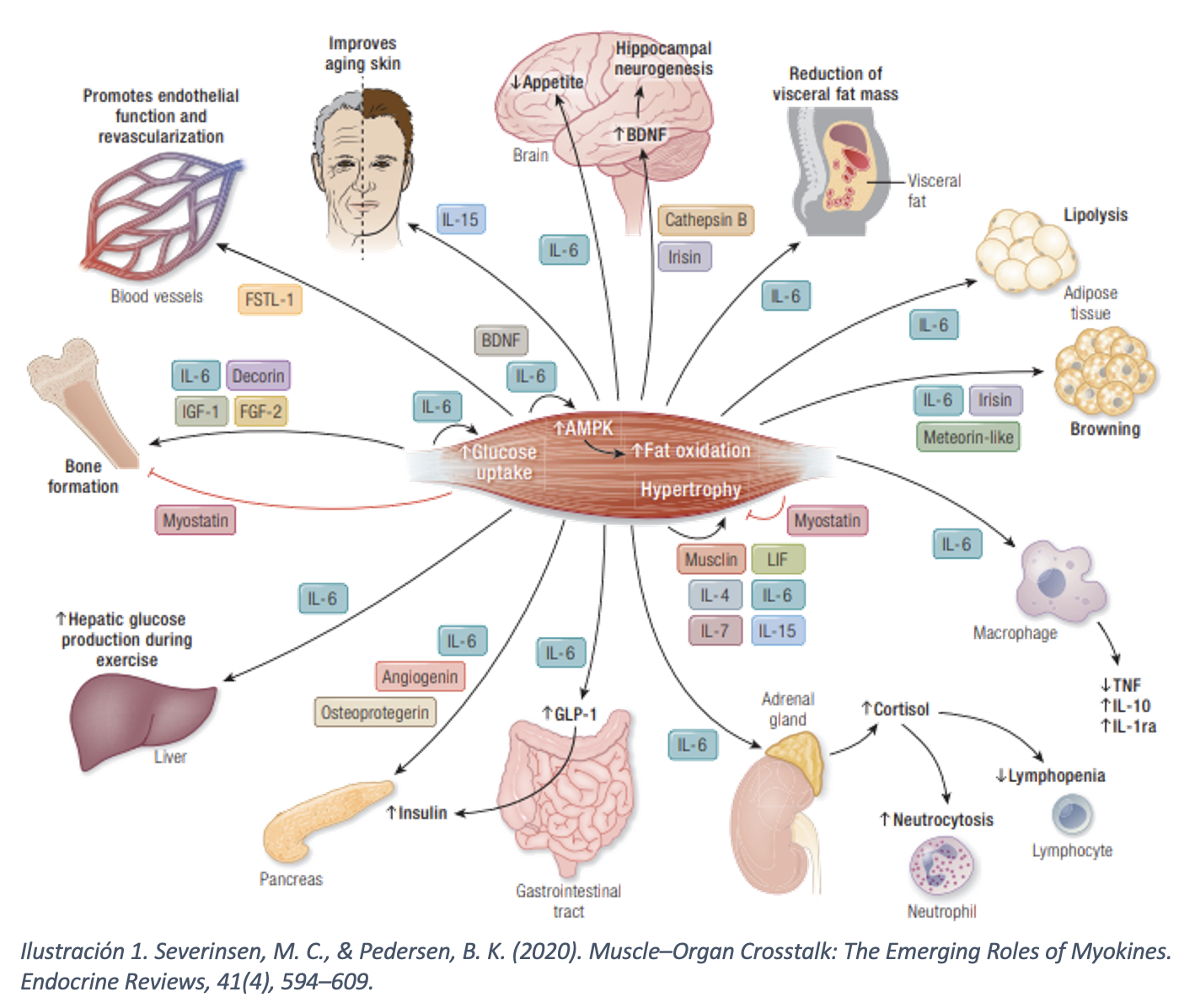 - Severinsen, M. C., & Pedersen, B. K. (2020). Muscle–Organ Crosstalk: The Emerging Roles of Myokines. Endocrine Reviews, 41(4), 594–609.