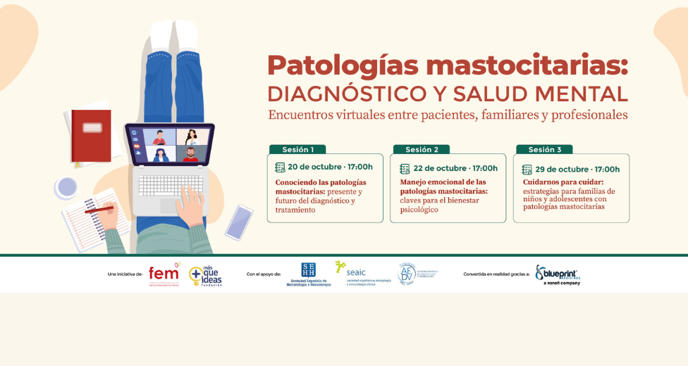Este ciclo de tres encuentros virtuales, que combina el formato webinario con dos talleres prácticos para pacientes y familiares, está creado y liderado por la Fundación Española de Patologías Mastocitarias (FEM) y la Fundación MÁS QUE IDEAS y cuenta con la colaboración de SEAIC, a través de la partición en el programa de la jornada.