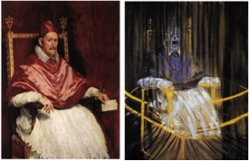A la izquierda, el cuadro de Diego Velázquez «Inocencio X», 1650; óleo sobre lienzo, 140 cm x 120 cm, Galería Doria Pamphili, Roma.  A la derecha, el cuadro de Francis Bacon, «Estudio según el retrato del Papa Inocencio X por Velázquez», 1953; óleo sobre lienzo, 153 cm x 118 cm, Art Center, Des Moines (EE.UU.).