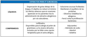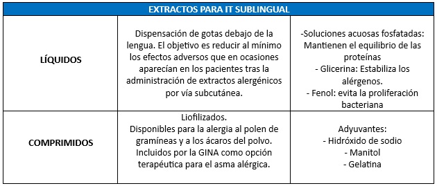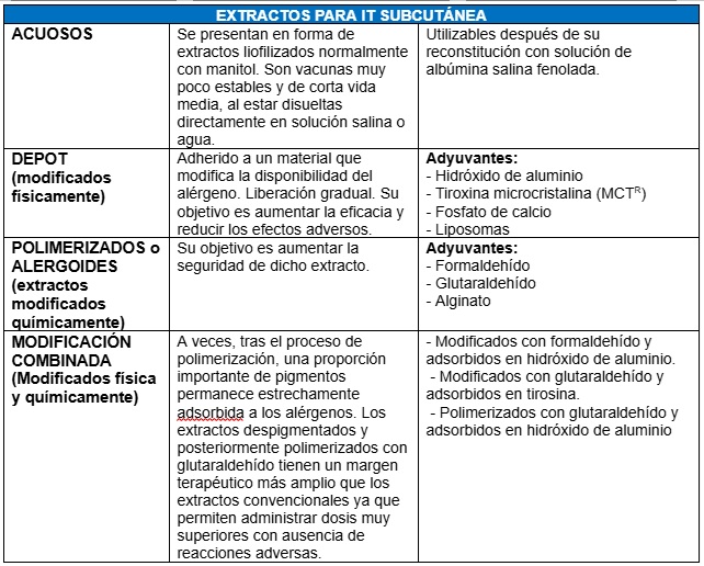 Los extractos para inmunoterapia subcutánea (ITSC) pueden ser acuosos, depot, polimerizados o modificación combinada. En la inmunoterapia sublingual (ITSL) la composición del extracto alergénico es la misma que en la ITSC, pero se modifica el excipiente. Los excipientes pueden ser líquidos o comprimidos liofilizados.