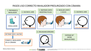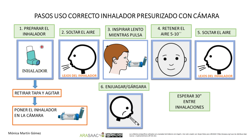 6-Aguantar la respiración entre 5 y 10 segundos y soplar lentamente (En caso de agudización se puede inhalar y exhalar en cinco ocasiones sin retirar la cámara de la boca y también en menores de 5 años)