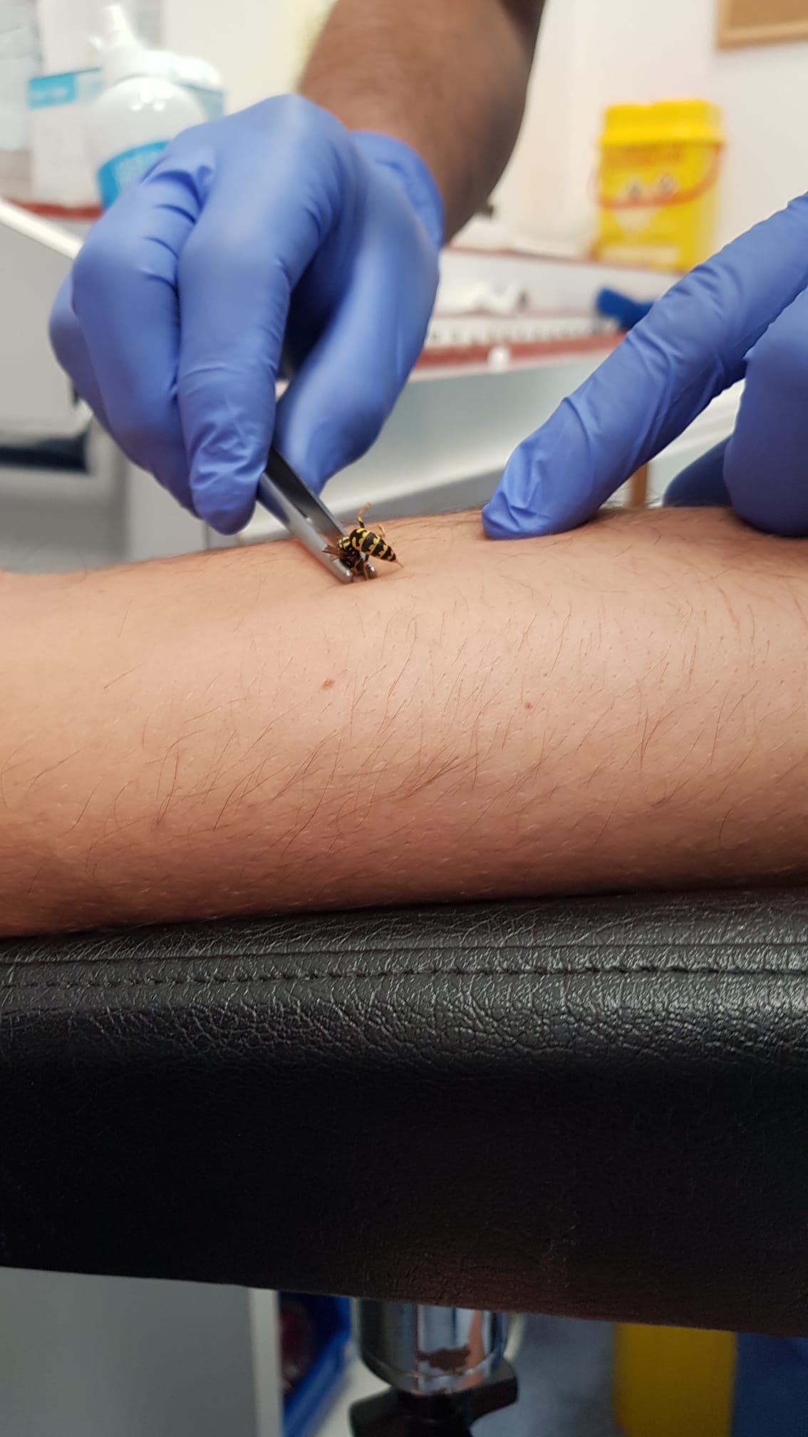 Esta técnica se realiza en el hospital, en condiciones totalmente seguras, por parte de personal sanitario especializado del servicio de Alergia. Consiste en exponer de forma controlada al paciente al veneno del insecto (abeja o avispa) al que es alérgico, con el objetivo de comprobar si ya tolera la picadura gracias a la inmunoterapia. Todo se lleva a cabo en el hospital de día, que es un entorno preparado para actuar rápidamente en caso de que ocurra una reacción adversa.