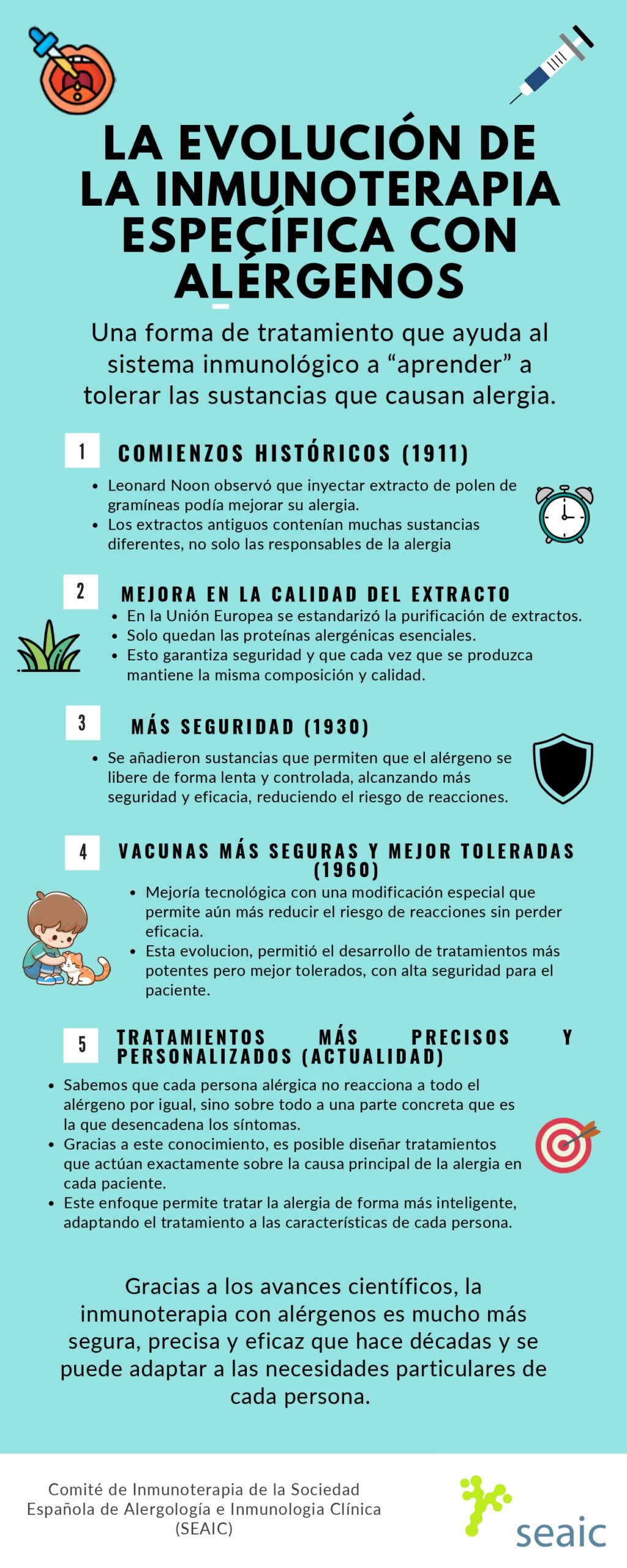 El Comité de Inmunoterapia de la Sociedad Española de Alergología e Inmunología Clínica (SEAIC) comparte una infografía divulgativa sobre la evolución de la inmunoterapia específica con alérgenos, desde sus inicios históricos hasta los avances actuales en seguridad, estandarización y personalización del tratamiento.