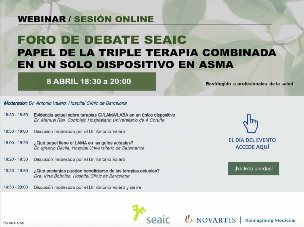 En el reproductor superior, puede consultar la grabación del seminario web titulado “Foro de debate SEAIC: papel de la triple terapia combinada en un solo dispositivo en asma”, que se celebró el pasado 8 de abril de 2021.